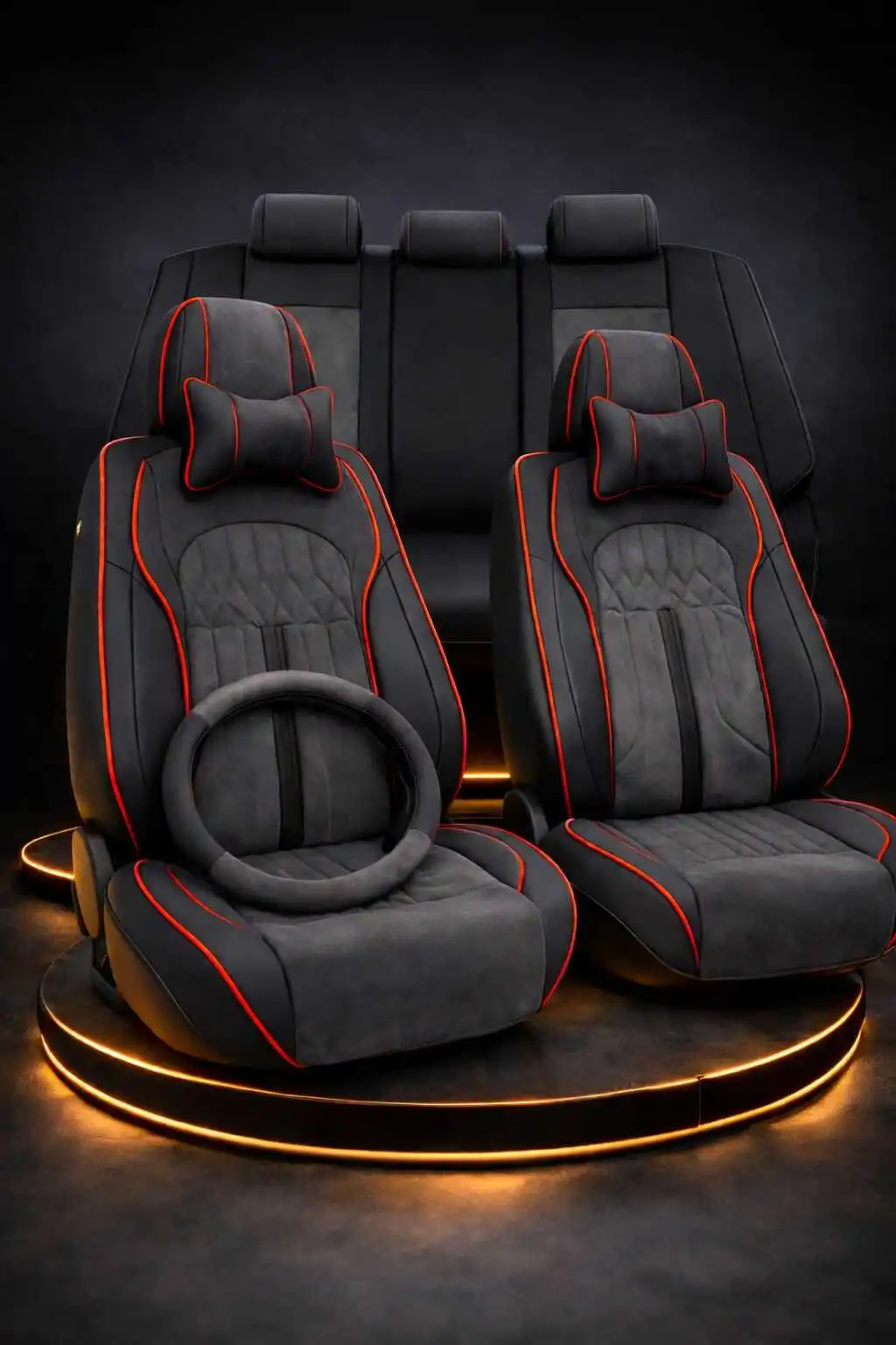 סט כיסויי מושבים איכותי בעיצוב מודרני וספורטיבי בצבע שחור עם פסי גימור אדומים, המעניק לרכב מראה יוקרתי ומיוחד תוך שמירה על המושבים המקוריים מפני לכלוך ושחיקה.